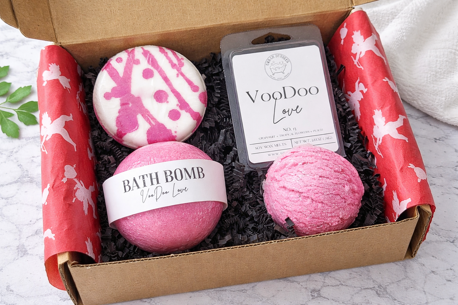 Inside you’ll find 1 Bath Bomb, 1 Bubble Bath Scoop, 1 Shower Steamer, and 1 Wax Melt.