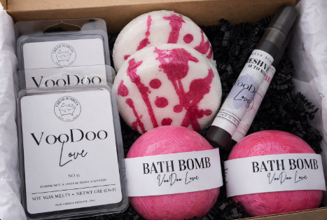 Inside you'll find 2 Bath Bombs, 2 Shower Steamers, 2 Wax Melts, and 2 travel size Room & Linen for on-the-go.